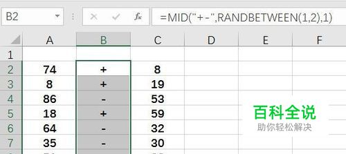 选择A2:A9,输入以下公式,按Ctrl+Enter组合键结束 =CHOOSE(FIND(B2,"+-"),RANDBETWEEN(0,99-C2),RANDBETWEEN(C2,99))