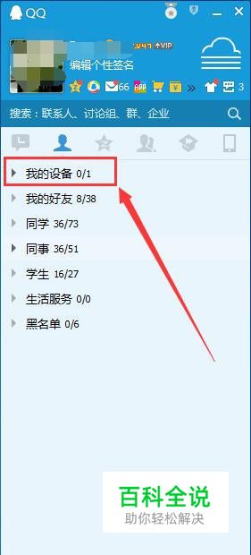 首先,在电脑端登录QQ。打开QQ的主面板,找到“我的设备”,如何所示,单击,显示设备名称。