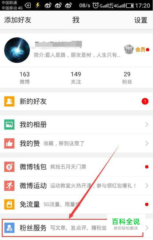 打开登录微博后,在个人页面点击“粉丝服务”,如图所示: