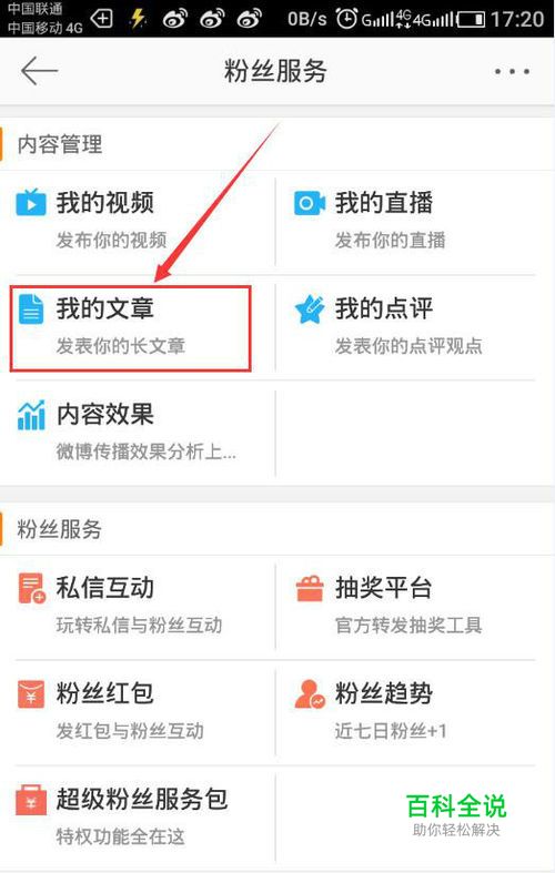 进入粉丝服务页面以后可以看到有很多功能,先不要管,我们点击“我的文章”,如图所示: