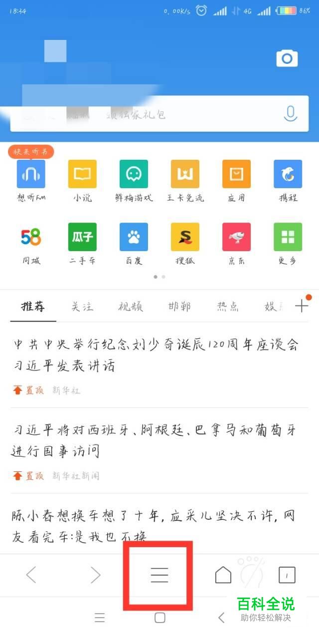 打开QQ浏览器后,点击页面下方中间的图标(有三条杠的图标)。