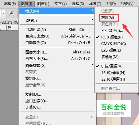 使用ps打开我们的图片素材,然后找到图像菜单里的模式选项,点击该选项在其内找到灰度,如图所示: