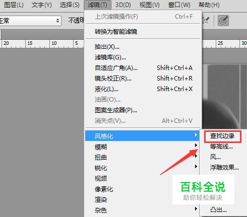 点击灰度选择扔掉将图片转为灰度图,然后再在滤镜里找到风格化选项,点击该选项在其内找到查找边缘选项,如图所示: