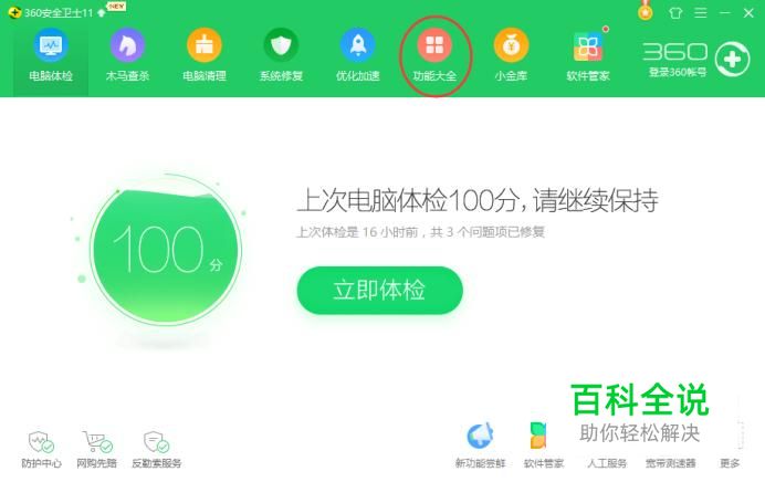 点击“360安全卫士”主界面上方工具栏中的“功能大全”。