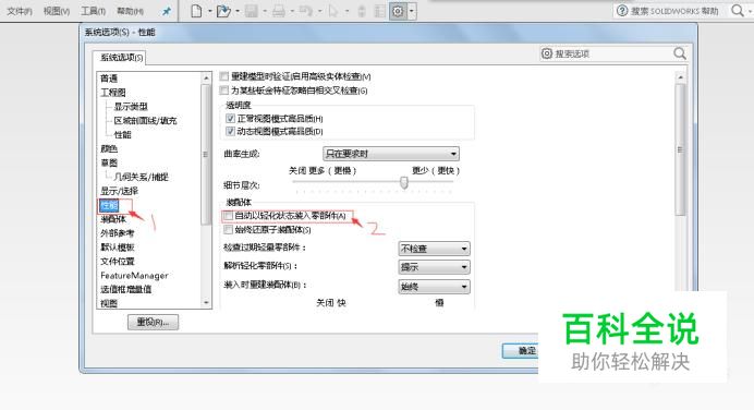 在该对话框中,点击“性能”然后在右侧出现的装配体选项中,把“自动以轻化状态装入零部件”打上对号,再点击“确定”