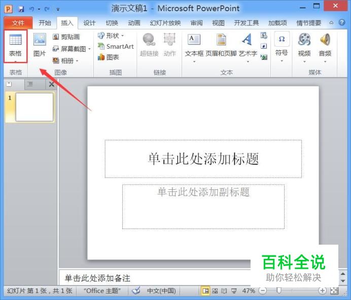 打开PPT之后我们找到插入选项里的表格选项,如图所示: