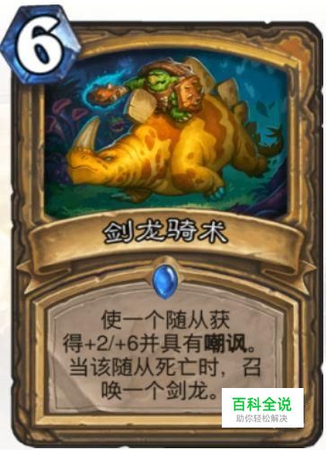 剑龙骑术:圣骑士职业蓝卡,来自勇闯安戈洛版本。+2/+6变嘲讽这个增益,比牧师5费法术真言术触还多了一个嘲讽,6费只能算中规中矩,但是加了亡语召唤一个426嘲讽的剑龙,这张法术就明显超模了。无论是什么随从,加了剑龙骑术,都能消耗对手不少时间。