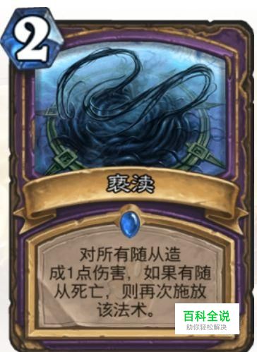 亵渎:术士职业蓝卡,来自冰封王座的骑士版本。这张卡的厉害之处在于防快攻清场还不用卖血,只要消灭随从就能不停释放(当然释放次数有上限14次)。比如对手场上123血怪各一个,只需要一个亵渎,就能清掉这三个怪了。相比起4费全场打3的地狱烈焰,亵渎更实惠,也更容易打出高AOE。