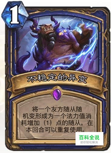 不稳定的异变:萨满职业紫卡,来自狗头人与地下城版本。1费能循环使用,一次一费,在后期使用,一回合最多能进化十次,还可以分开选择不同的目标,十次过后,场上基本上都能变成优质怪了。如果进化出一个法师学徒光照元素之类的,就能0费无限进化了。