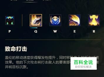 Q-致命打击 盖伦移除身上的所有减速效果,并获得30%移动速度加成,持续1.5/2/2.5/3/3.5秒。 在接下来的4.5秒内,他的下次普通攻击会造成30/55/80/105/130(+1.4AD)物理伤害,并沉默目标1.5秒。 由技能简介我么可以明白这个技能具有沉默、加速、消除减速debuff三个强力的效果。1.5秒不能放技能的时间能够让盖伦做出很多事情。而这个技能也是盖伦唯一一个能够增加盖伦机动性的技能,30%的移速加成可以说很高了。