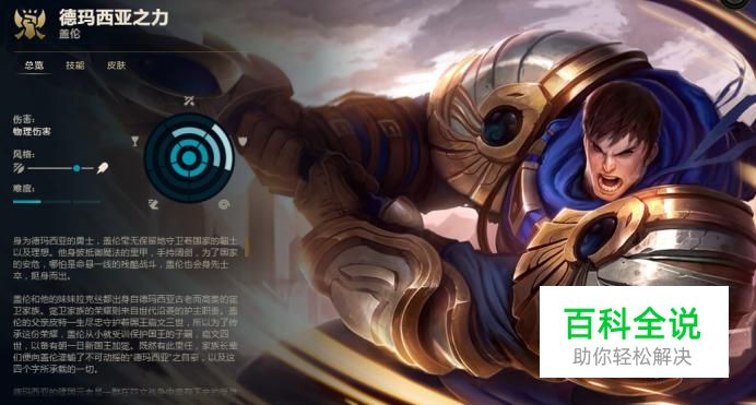 身为德玛西亚的勇士,盖伦毫无保留地守卫着国家的疆土以及理想。他身披抵御魔法的重甲,手持阔剑,为了国家的安危,哪怕是命悬一线的残酷战斗,盖伦也会身先士卒,挺身而出。由背景故事我们可以知道盖伦的定位就是一个具有输出的重装坦克