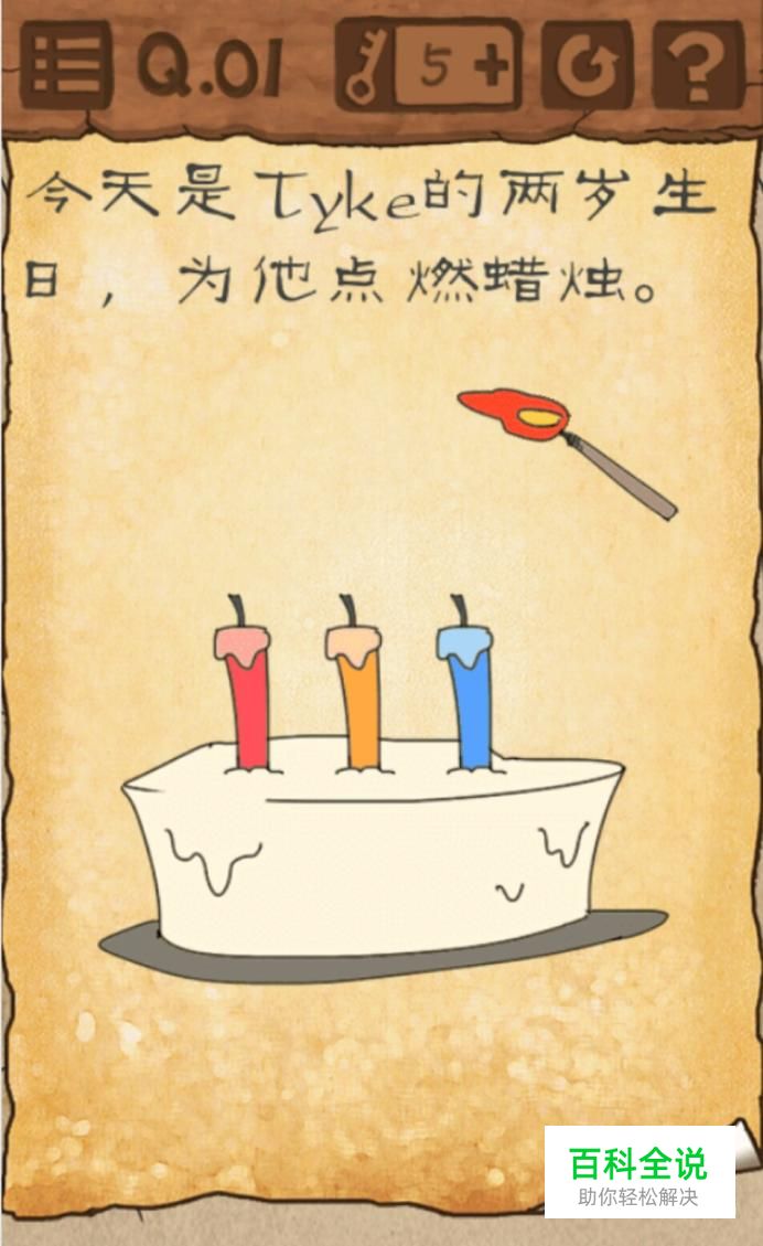 第一关:用火柴把中间的那根蜡烛点燃,然后摇晃手机,只有点燃了两个蜡烛就过关了。