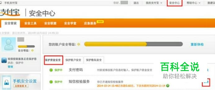 然后找到【保护资金安全】列表下得【短信校验服务】,点击"管理"