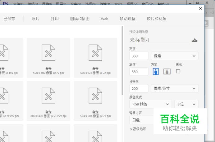 打开ps软件之后,我们新建一个画布(选择文件-新建或者是快捷键Ctrl+N都是可以的),小编就新建了一个350*350的画布给大家做示范。