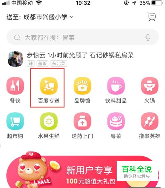 点外卖 进入主页,点击进入“百度专送”页面,选择您要购买的外卖,如:精品套餐,再点击“更多”。