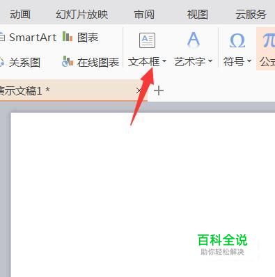 首先我们打开一个PPT,然后在最上边的菜单栏中找见插入,我们首先插入一个横向的文本框做演示,当然你也可以插入图片来应用,如下图所示: