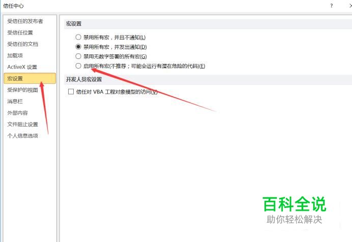 进入信用中心设置后,在左侧栏里找到宏设置,在右侧点选启用所有宏即可。