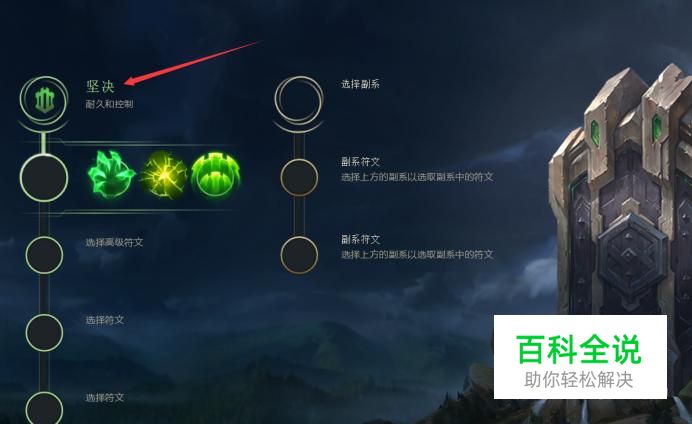 主符文加点文第一个:坚决,坚决的符文效果为加里奥提供耐久和控制使其更能抗伤害。