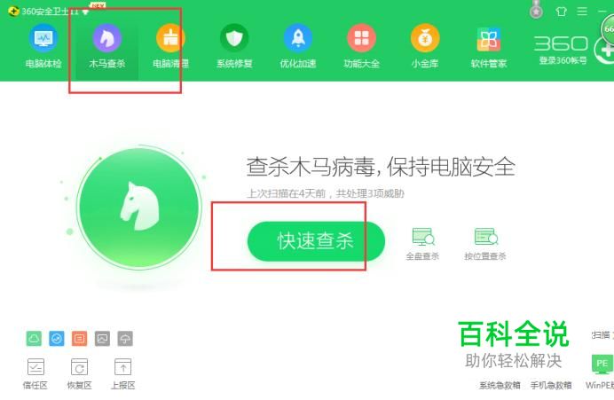 杀毒软件 在电脑上安装一款杀毒软件,常用的杀毒软件有360和电脑管家,然后点击【木马查杀】进行杀毒操作,如下图所示: