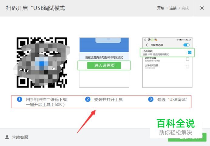 安装好之后打开应用宝,会提示我们用手机扫码开启USB调试模式,按照操作开启USB调试模式。