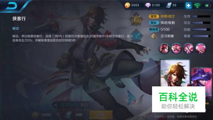 被动技能-侠客行 (一)技能解析:李白的这个技能能够使得李白第四次普通攻击的伤害提升5%。 (二)使用技巧:在李白追击敌人的时候,应该尽量用普攻和技能相结合,才能更好的对敌方英雄造成伤害,不要怂。