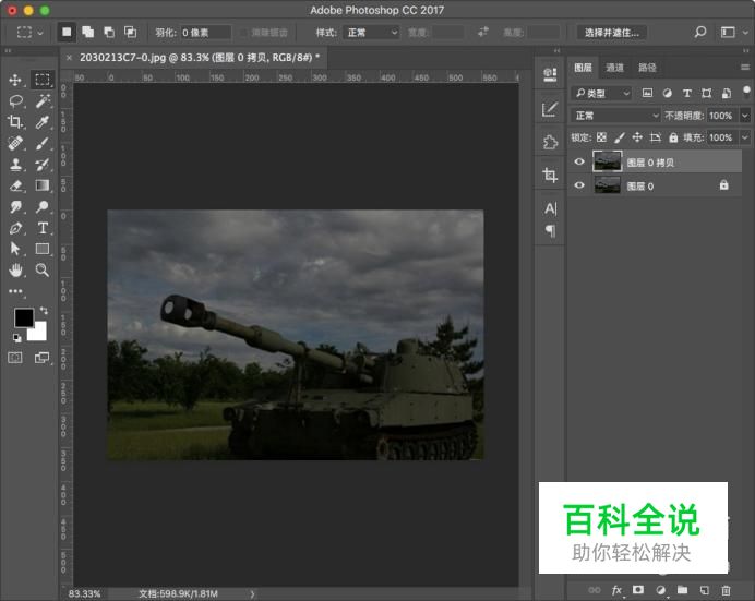 打开电脑中的PS,拖入需要进行处理的图片打开,以下图为例,我看可以看到整个坦克的色调严重偏暗。