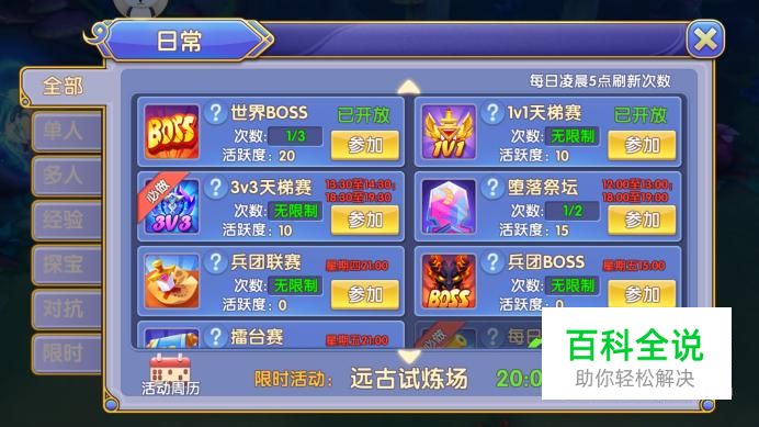 进入日常活动界面,点击“1v1天梯赛”参加,活动每日参加次数不限,每天最多获得10点活跃度奖励。