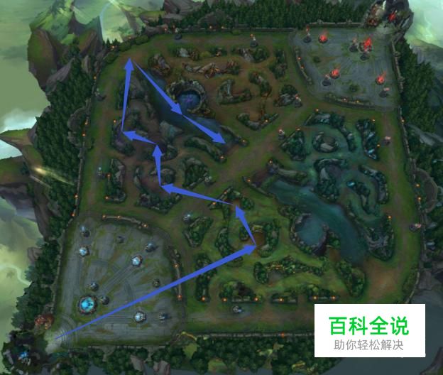 正方形打野的第一阶段:(假设我们是蓝色方)红buff开,按照如图所示的路线刷第一波野怪。魔沼蛙刷完以后可以选择去上路GANK,但是注意停留时间不要太久,没有机会就去打河蟹,然后去蹲中路,没有机会就回家。(红色方同理)