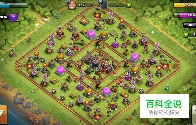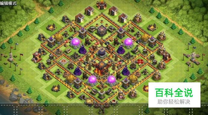 这个阵法小编给它起了一个名字叫太极护资源阵,因为我们将黑水和大本营放在太极的中间,四周环绕迫击炮和电塔,如图太极图一般,然后将四个圣水瓶和四个储金罐放在第一圈儿外围,虽然看上去很近,但是四个储金罐冠周围却是火力点最强的位置,因为它有法师塔,普通的小炮,箭塔以及弩箭的加持,这种规则的阵型,让敌方不知从何下手