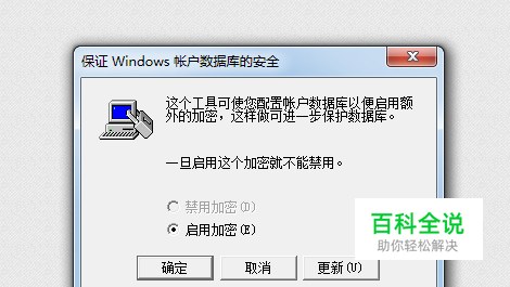 着弹出“保证Windows XP账户数据库安全”界面,单击“更新”按钮。在“启动密码”界面中点选“密码启动”单选框,接着输入系统启动时的密码并再次确认,最后单击“确定”按钮即可。