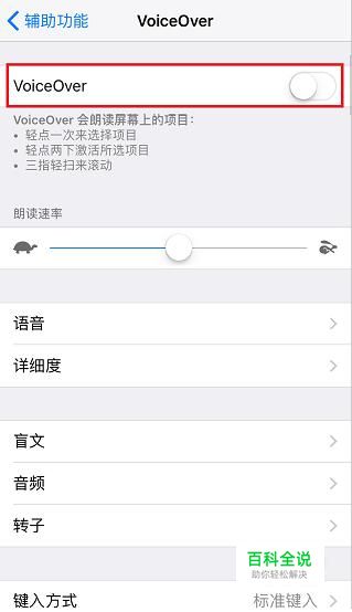 通过对“VoiceOver”开关的控制,成功对苹果手机的盲人模式进行开启或关闭。