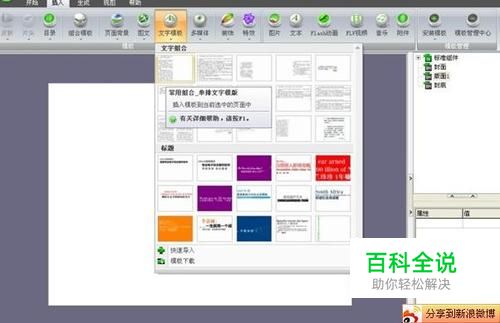 首先打开软件点击右边的版面激活插入菜单,然后插入一个文字模板 例插入:常用组合_单排文字模板