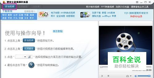 我们不妨先来看下这款转换工具的界面使用方法,如下图所示:打开视频转换器,点击软件界面左上角添加视频: