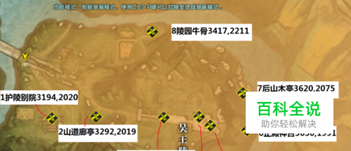 最优化线路:按如下1-8数字标记的地点依次找寻。 1护陵别院3194,2020 2山道廊亭3292,2019 3陵园石佛3442,2017 4陵园红烛3520,2011 5陵园焚香3547,2001 后面的那个方鼎里面,跳上去才看得到 6正殿神台3630,1991 7后山木亭3620,2075 8陵园牛骨3417,2211