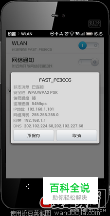 第三招:检查WIFI的密码 通常情况下,WIFI的密码被更改以后手机连接不上,需要手动更新WIFI的密码。 点击WLAN网络地址,选择不保存网络,然后重新输入密码即可。
