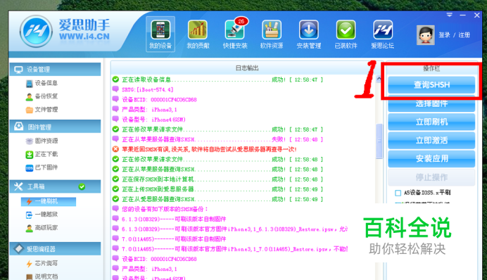 众所周知,苹果IOS7正式版出来之后就关闭了苹果软件低版本的验证通口!相信很多人和我一样手痒升级到了ios7版本,却发现根本就不是自己想要的,那么我们怎么才能从ios7降级到6.1.3/6.1.2呢? 一.首先,先下载爱思助手 二、打开软件,把手机连接电脑,确保手机为连接状态。 上图为操作的步骤,下面我详细为大家介绍! 三、点击右侧的:查询SHSH,然后按照提示让手机进入DFU模式! 进入DFU模式后,我们可以清楚的查询到手机的SHSH备份,进行到这一步,如果你的手机没有SHSH备份,那么后面的步骤你可以不看了! 四、对应你的SHSH备份下载苹果固件,我的是6.1.3,所以我下载的是6.1.3 五、点击右侧“选择固件”,然后选择你下载好的对应固件版本 六、点击右侧“立即刷机”,然后无需操作,软件将自动进行刷机,直到成功 上图可以看出,成功提示!
