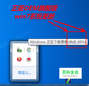 新Win7安装完毕之后,在系统任务栏中,我们点击向上弹出的上拉小窗中可看到“Windows 正在下载更新”的字眼,并且附有更新的进度。