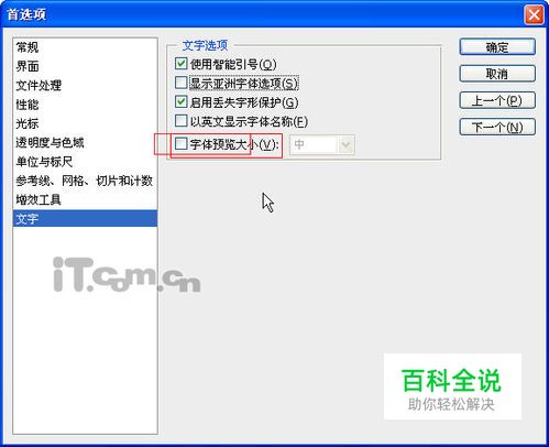 2、打工首选择项对话框后,在文字选项中取消“字体预览大小”,然后单击确定,并重新启动Photoshop CS3这样问题就解决了。