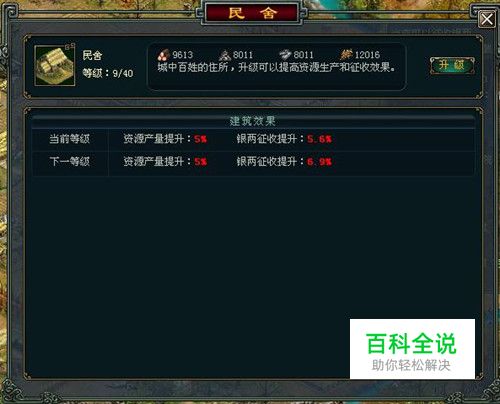 人口是第一生产力 都说人多力量大,游戏中民舍等级决定着各种资源的采集效率;同时还影响税收的多寡。民舍等级越高获得的资源和银两就越多,所以第一要务就是使其拥有足够等级,它是我们必须首要升级的建筑。