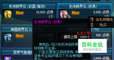 两种跨界石价格一览表: 1-70级神器跨界石: 900点券; 71-80神器跨界石: 4900点券; 史诗跨界石(防具): 9900点券; 史诗跨界石(武器/首饰):19900点券;
