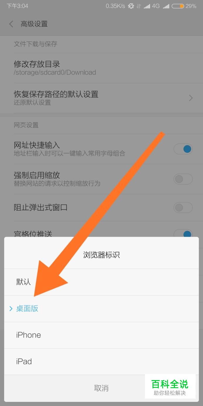 最后把浏览器标识改为“桌面版”即可。设置完成后用手机浏览器上网,默认打开的都是电脑版网页。