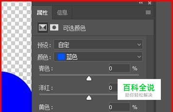 再从图层面板中添加可选颜色;界面上显示出可选颜色的面板。在颜色这一项中设置为蓝色。