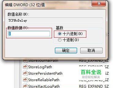 把新建的REG-DWORD改名为:TCPNoDelay【方法就像修改文件名一样】然后双击TCPNoDelay后,把数值数据改成1,基数点选【十六进制】