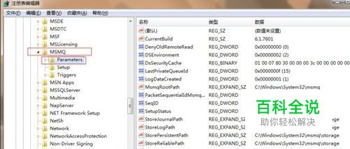 2:在注册列表里打开一下条目:HKEY_LOCAL_MACHINE/SOFTWARE/Microsoft/MSMQ/Parameters 完整条目如下,xp系统下注册列表和win7的也差不多。