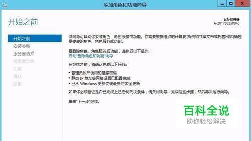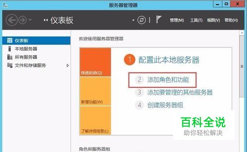 在服务器管理器右侧的面板中单击选择“2 添加角色和功能”选项,打开“添加角色和功能向导”窗口。