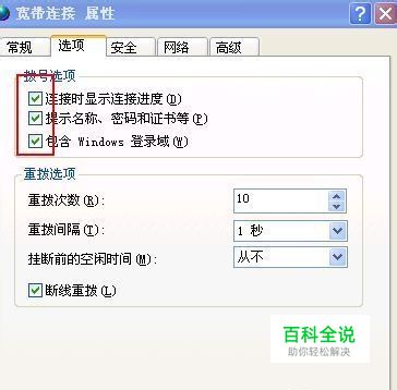 鼠标指向 宽带连接后 右键选择 属性—— 选项,将这里的选项上面的三个方框的 “√”通通去掉,点击 确定,