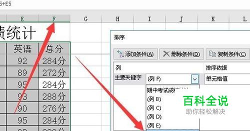 可以看到总分为F列,所以在下拉菜单中我们选择列F菜单项。