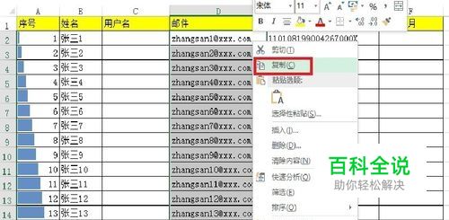 截取邮件地址: 选中需要截取的邮件地址的全部单元格,复制全部单元格。