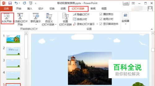打开PowerPoint2013文件,切换到【幻灯片放映】选项卡,在【开始放映幻灯片】组中单击【从头开始】按钮。