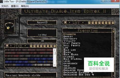 如图,以下的1方框是装备所有的属性的编码,不同的颜色表示不同的属性,其中就有表示吸血百分比的属性。在1方框中移动鼠标光标,方框3会显示出这一项代表什么属性,方框4则表示这一属性当前的数值。 那么在方框1中移动鼠标到方框2的位置,方框3显示“Life Stolen Per Hit Min",这就是我们要找的属性。
